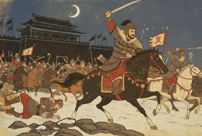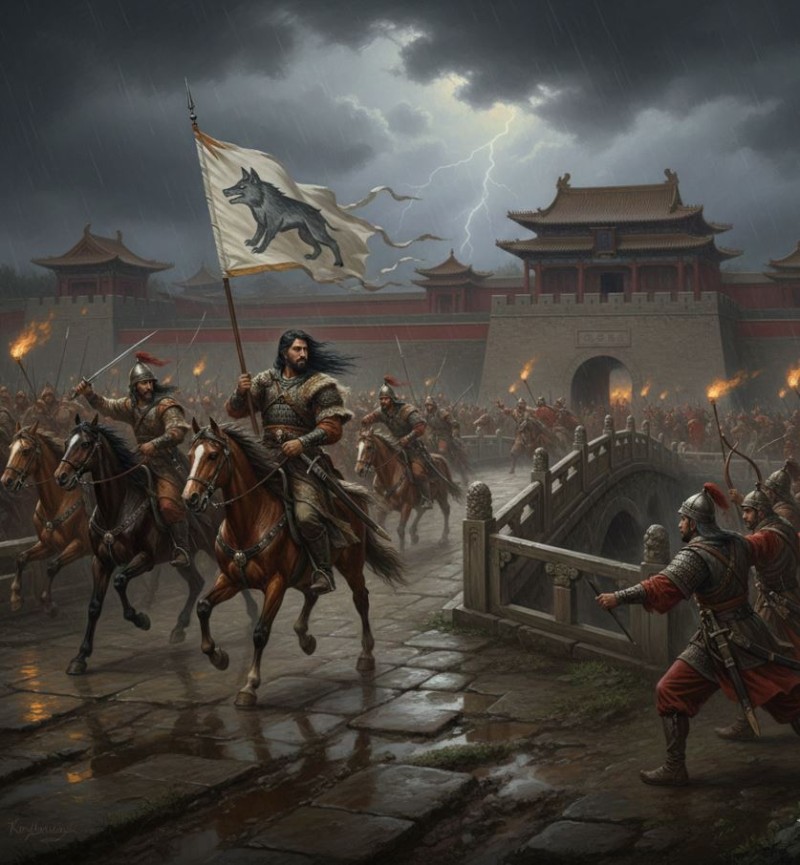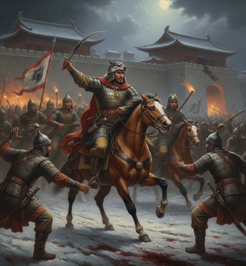 Gerçekten o gece 40 Türk asilzadesi, Çin imparatorluk sarayını bastı. Pek kanlı bir vuruşma oldu. Yüzlerce Çinli muhafız, 40 Türkün keskin nişancılığı ve vuruş mahareti karşısında can verdi. Türk okları ve kılıçlan, yıldırımlar gibi yağıyor ve değdiği yerden sütunlar halinde kan boşanıyordu. Ancak Çin İmparatoru'nun hassa kuvvetleri, yerden mantar bitercesine çoğalıyor , bir ölü muhafızın yerini on kişi alıyordu. Öyle bir an geldi ki, Kür Şad, İmparator'un ele geçirilmesine imkan olmadığını anladı. Sarayı terk etmek emrini verdi. Ancak yaya olarak kaçmaya kalkışmak delilikti.