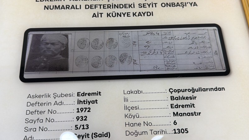 Kaşdemir, bulunan belge ve fotoğrafın Seyit Onbaşı’nın askere alındığı döneme ait olduğunu belirterek, belgelerin köyündeki müzeye hediye olarak teslim edildiğini ifade etti.