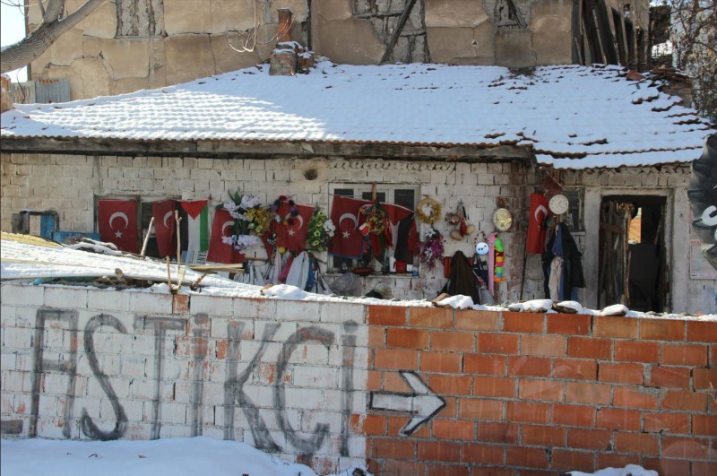 Gri beton duvarlarını al bayraklarla ve çiçeklerle donatan Necip Uysal’ın evi, bugünlerde görenleri hem duygulandırıyor hem de derin derin düşündürüyor. Her sabah rızkının peşine düşen Uysal, bayrak hassasiyetini şu sözlerle dile getiriyor: