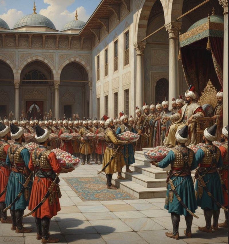 Yeniçeri askerleri, üç ayda bir aldıkları maaş (ulufe) günü Topkapı Sarayı’na gelirlerdi. Padişahın ikram ettiği yemeği yiyen askerler, memnuniyetlerini ve sadakatlerini göstermek adına kendi aralarında topladıkları paralarla hazırlattıkları renkli şekerleri padişaha sunarlardı.