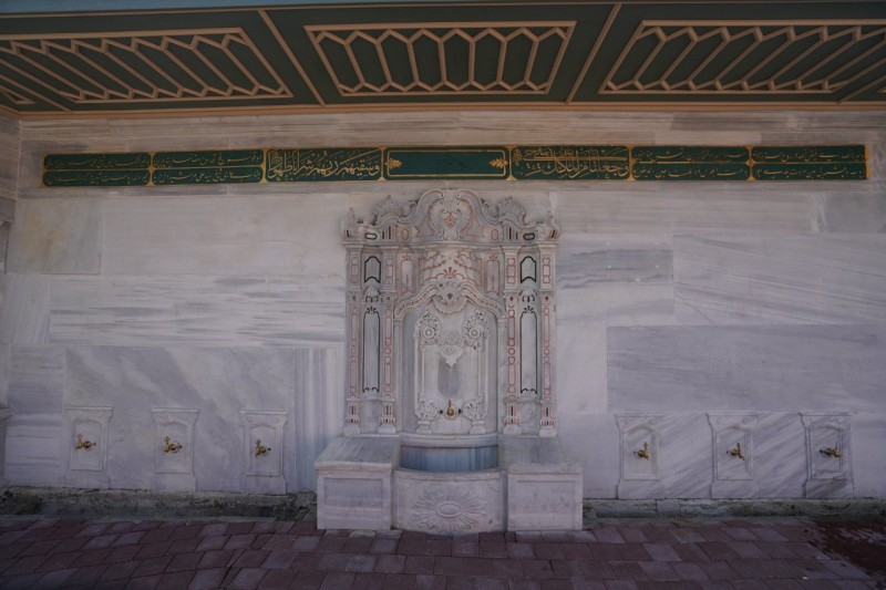 Tekke Maslağı Sokağı’na bakan cephede yer alan Barok üsluplu çeşme, restorasyonla eski ihtişamına kavuştu. Çeşmenin her iki yanında bulunan üçer adet abdest musluğu ve yapının iki ucundaki mermer kaplı yarım altıgen planlı çıkmalar, Osmanlı’nın estetik anlayışını bugüne taşıyor.