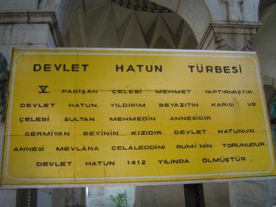 Devlet Hatun, Yıldırım Bayezid Han'ın hanımıdır. Devlet Hatun'un annesi Âbide Mutahhara Hatun, Mevlânâ Celâleddin-i Rûmî Hazretleri'nin oğlu Sultan Veled'in kızıdır. Hazret-i Mevlânâ'nın 11. babası Hazret-i Ebû Bekr-i Sıddık'tır.Mevlânâ'nın annesi Mü'mine Hatun, İbrahim bin Edhem Hazretleri'nin torunlarındandır. İbrahim bin Edhem'in 5. babası Hazret-i Ömerü'l Farûk'tur.(1)