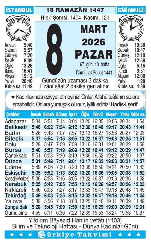 Yıldırım Bâyezid Hân’ın vefâtı (1403) Bilim ve Teknoloji Haftası - Dünya Kadınlar Günü