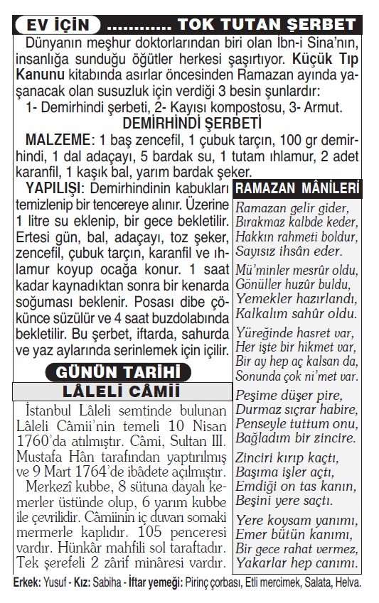 Erkek: Yusuf - Kız: Sabiha - İftar yemeği: Pirinç çorbası, Etli mercimek, Salata, Helva.