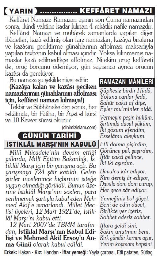 Erkek: Hakan - Kız: Handan - İftar yemeği: Yayla çorbası, Etli patates, Sütlaç.